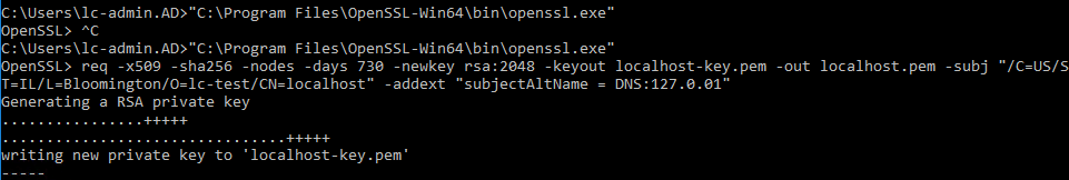 req -x509 -sha256 -nodes -days 730 -newkey rsa:2048 -keyout localhost-key.pem -out localhost.pem -subj "/C=US/ST=IL/L=Bloomington/O=lc-test/CN=10.0.0.6"